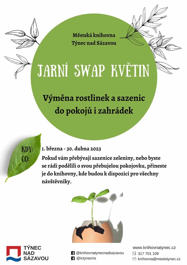Celý březen a duben si můžete z knihovny odnést sazeničku pokojovky, či sadbu na záhonek. Pokud byste se chtěli naopak o své přebytky podělit, vezměte je s sebou do knihovny, ať si je tu vyhlédne nový pěstitel.