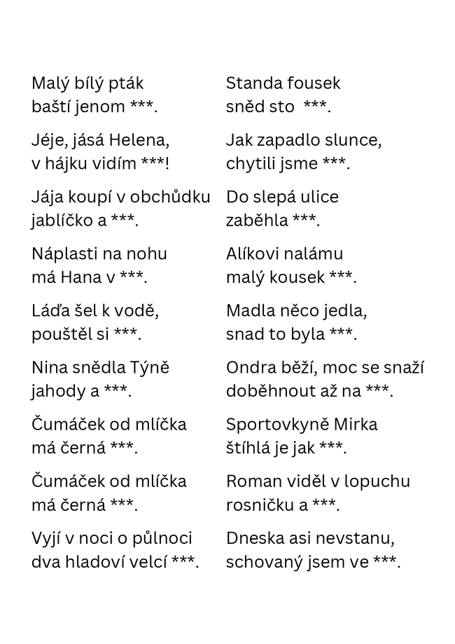 S knížkou Prázdniny s Oskarem jsme se naladili na blížící se volné měsíce. Úspěch u dětí mělo letní provedení hry dobble i povídání o oblíbené příchuti zmrzliny. Z příjemného stínu týnecké rotundy nás vyhnala bouřka, ale útočiště jsme našli v dětském oddělení, kde jsme si ještě pocvičili veršování. Předměty i zvířátka z přečteného příběhu jsme doplňovali do básniček převzatých z knihy Logopedické hádanky a ještě si u toho děti zaběhaly. Chcete-li si pocvičit rýmování i se svými dětmi, můžete využít připravený materiál.