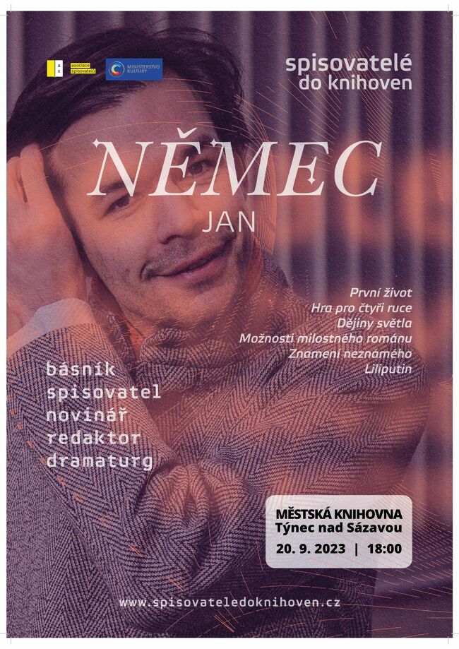 Vážení čtenáři, již ve středu 20. září zahájíme cyklus setkání se současnými českými autory Spisovatelé do knihoven. Od 18 hodin se můžete těšit na oceněného spisovatele a šéfredaktora literárního měsíčníku Host, Jana Němce.