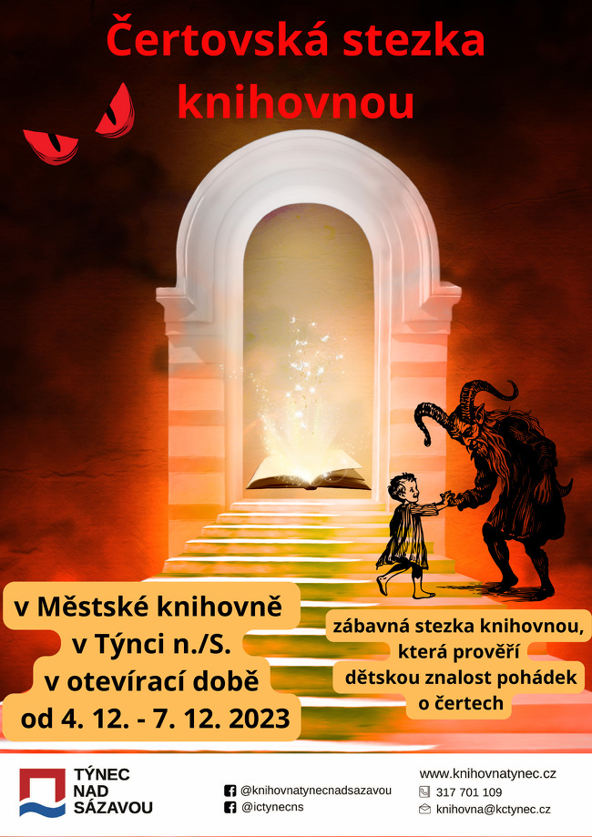 Srdečně vás a vaše ratolesti zveme na zábavnou stezku knihovnou, která prověří dětskou znalost pohádek o čertech. Čertovská stezka knihovnou je pro děti připravena v otevírací době knihovny od 4. 12. do 7. 12. 2023