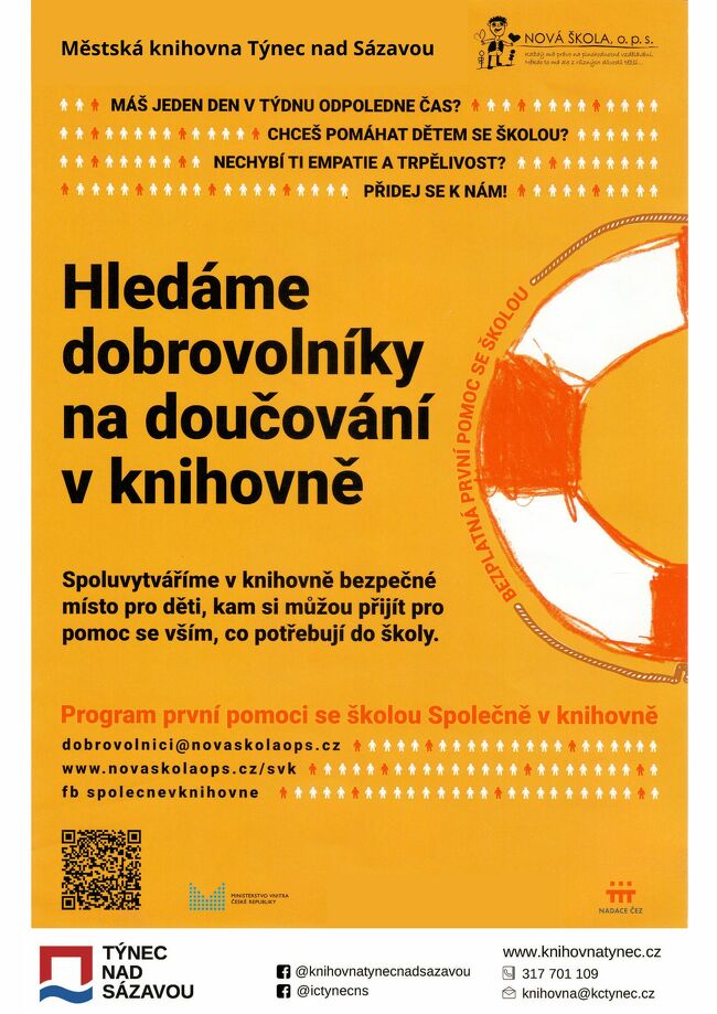 Rádi bychom týneckým dětem nabídli možnost doučování v knihovně, a to zdarma. Pro tento projekt hledáme dobrovolníky z řad studentů, dospělých i seniorů. Dobrovolníkům bude poskytnuta profesionální podpora ze strany organizace Nová škola, o. p. s.