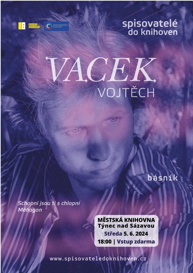 Ve středu 5. června od 18 hodin srdečně přivítáme kolegu knihovníka, ale především nadaného básníka, Vojtěcha Vacka, jehož dílo bylo přeloženo do několika jazyků a sbírka Měňagon z roku 2021 též ověnčena cenou Jiřího Ortena.