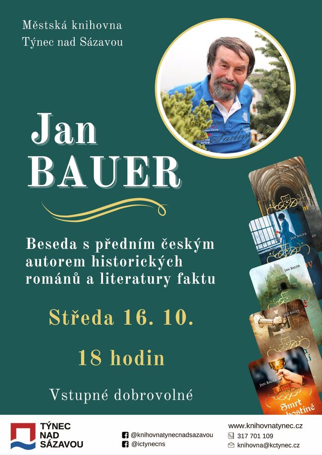 Srdečně zveme příznivce historických románů, literatury faktu i zajímavých setkání na besedu s předním českým autorem Janem Bauerem, který přijal pozvání do týnecké knihovny.