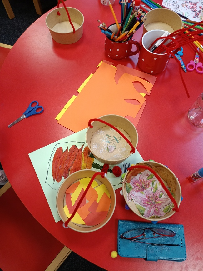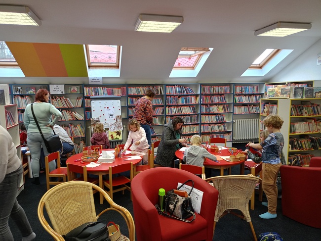 Děti zkušeně zaujala a atmosféru naladila paní Ivanka Nováková a pak už se tvořilo a hrálo... Děti si odnášely vlastnoručně vyrobené košíčky a další umělecká díla plná fantazie.