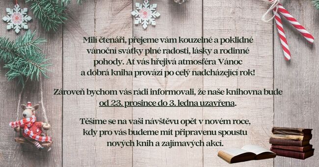 Zároveň bychom vás rádi informovali, že naše knihovna bude od 23. prosince do 3. ledna uzavřena.