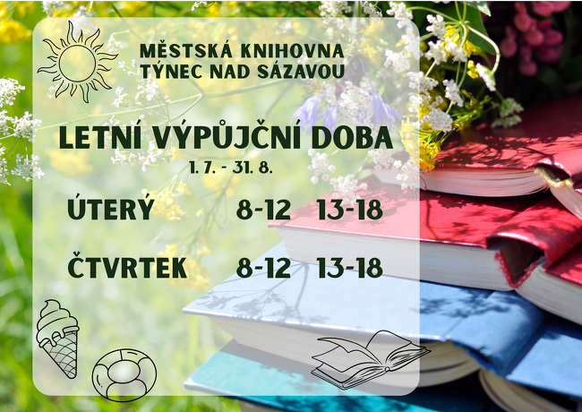 během července a srpna bude knihovna otevřena v úterý a ve čtvrtek vždy 8-12 a 13-18 hodin.