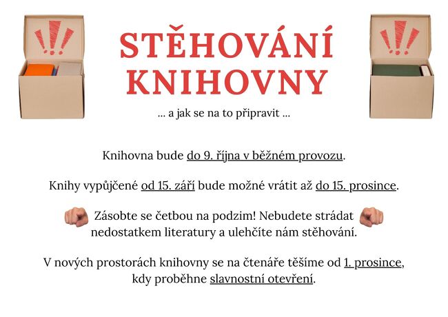 Knihovna bude otevřena do 9. 10. Poté své čtenáře přivítáme v nové knihovně, a to 1. 12. na slavnostním otevření a od 2. 12. v běžném provozu.